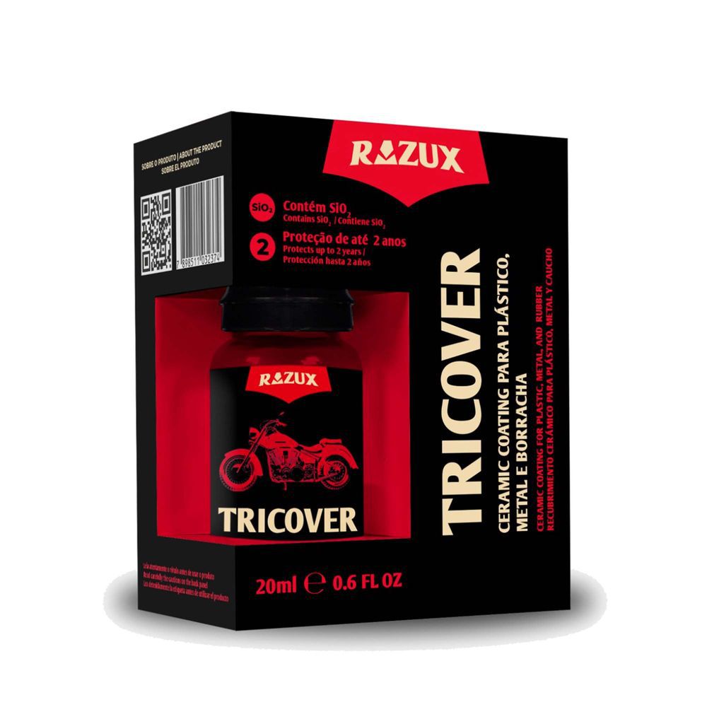 Razux Tricover - Ceramic Coating Para Plásticos, Metáis e Borrachas 20ml foi desenvolvido para renovar e proteger motor, plástico e borracha de motocicletas. Com dua formulação à base de SiO2, cria uma camada nanométrica resistente a altas temperaturas. O produto repele sujeira, evita corrosão precoce de metais e protege os plásticos e borrachas com durabilidade de até 2 anos. OBSERVAÇÃO: a cura parcial do produto é de 6h. Durante este período, manter a motocicleta protegida de intempéries. Tempo de cura total 72h.